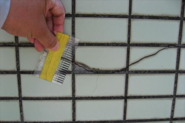 イルやモルタルの剥離・浮き・ひび割れ等、シーリングや仕上げ材の劣化を調査します。